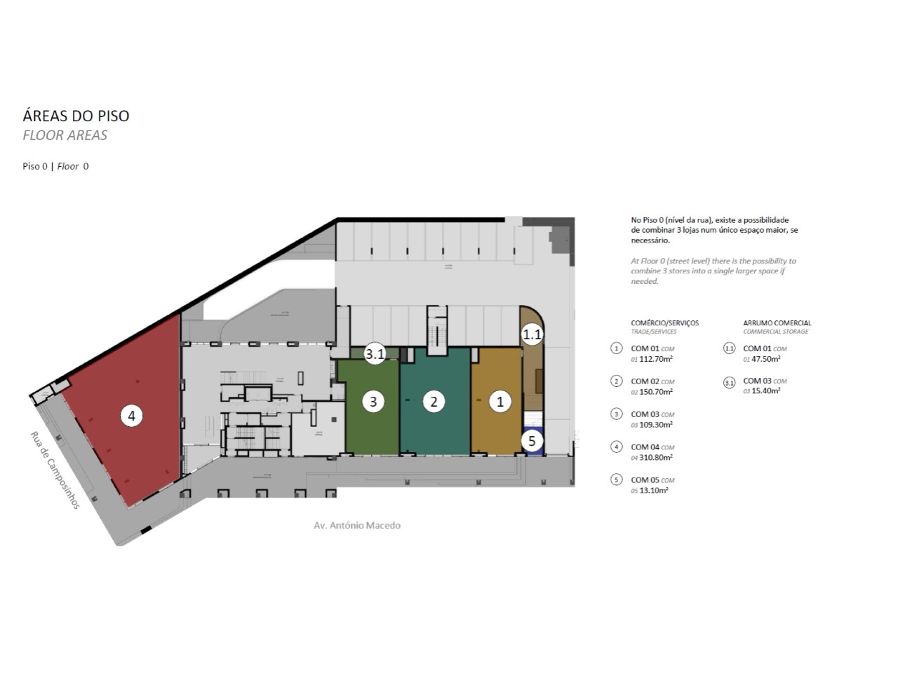 As lojas para arrendar variam entre 124 m² e 430 m², todas com montras amplas que asseguram luz natural e exposição. Algumas unidades dispõem de sala de arrumos, ampliando a funcionalidade dos espaços.